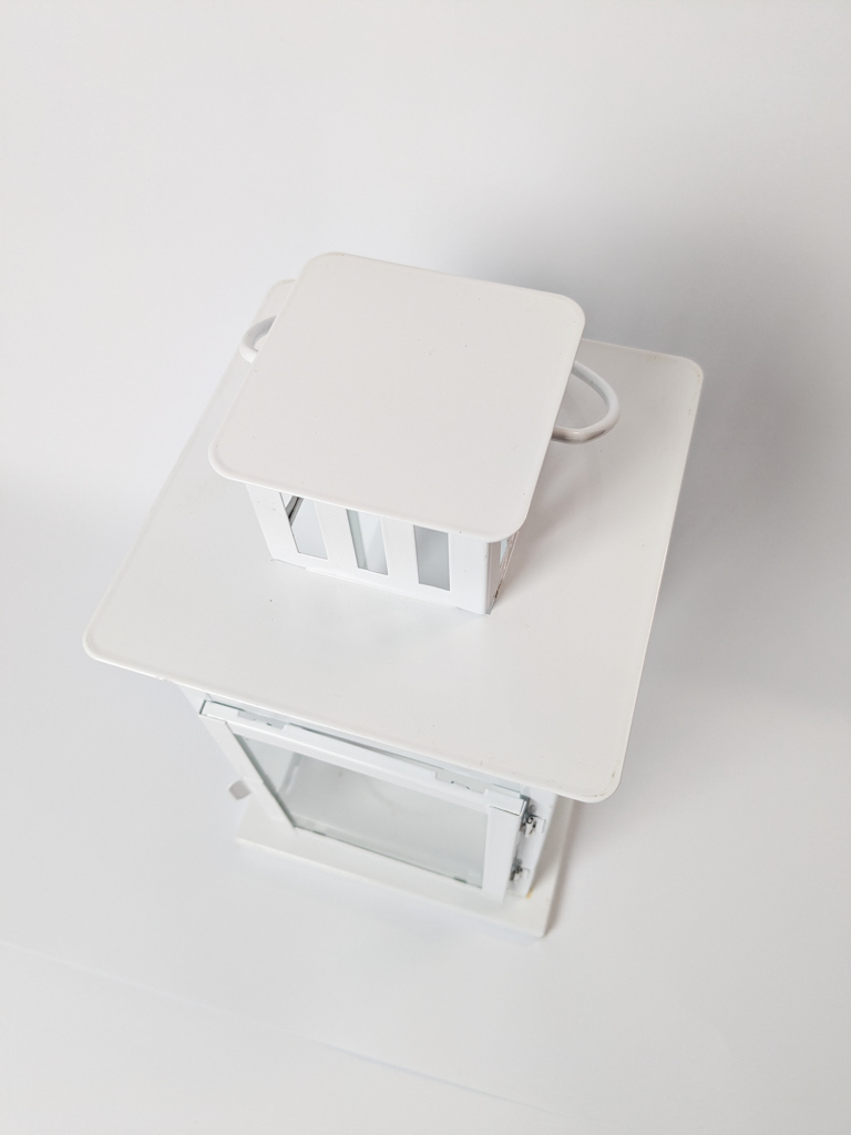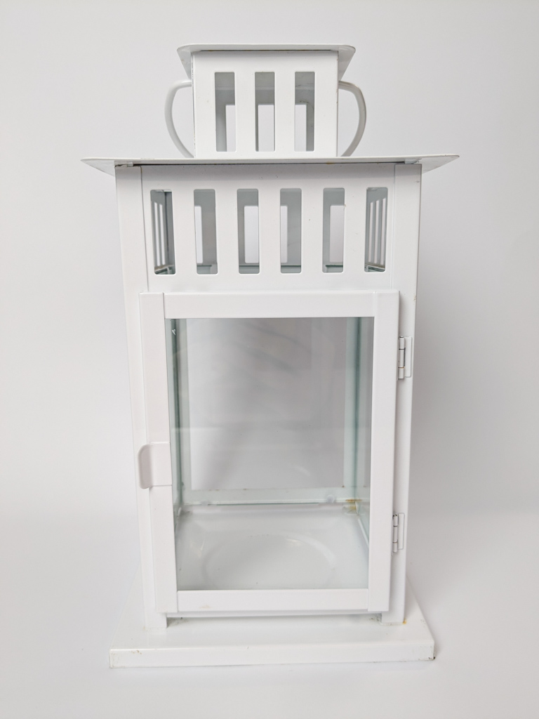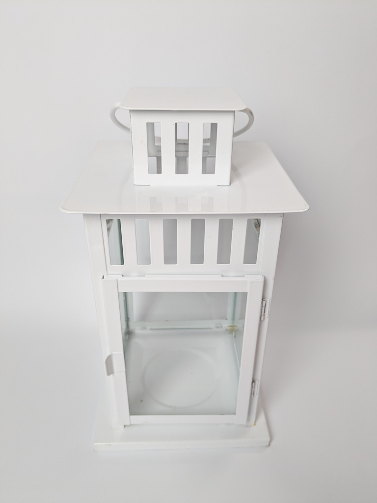 Fehér, fém lámpás tömbgyertyához. Felakasztható.