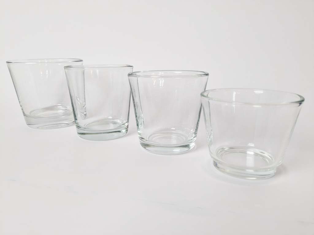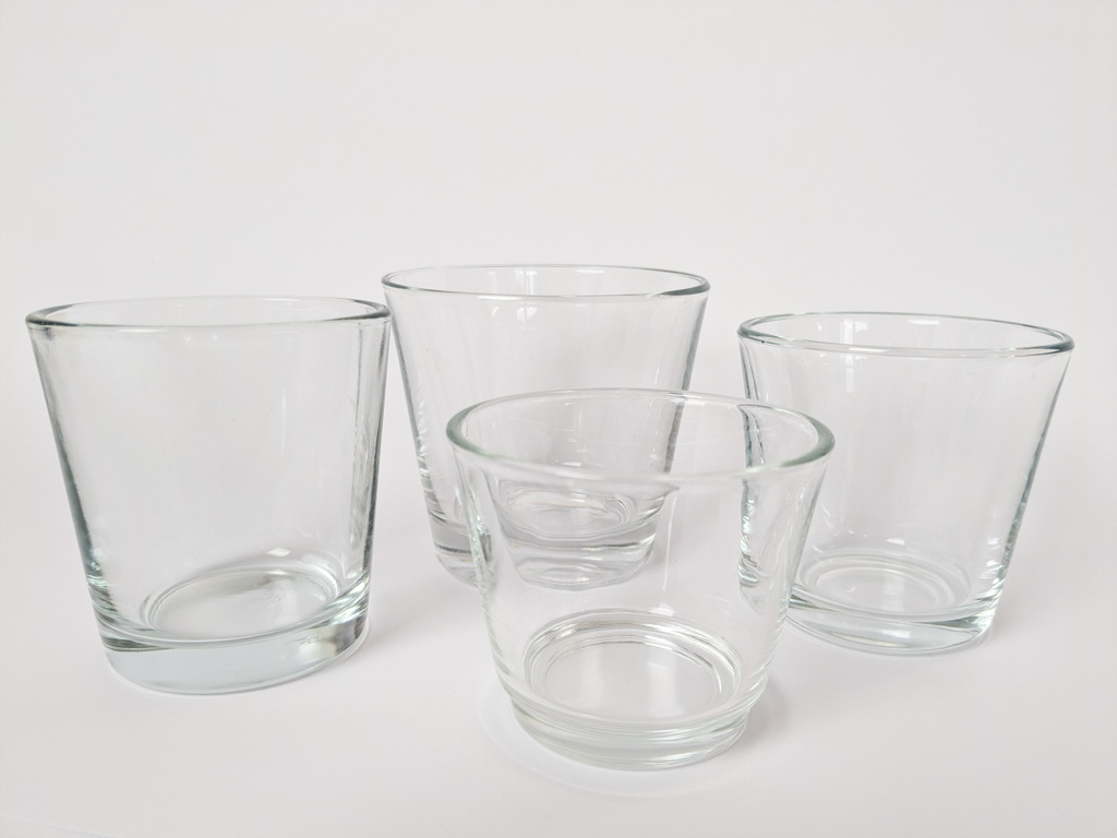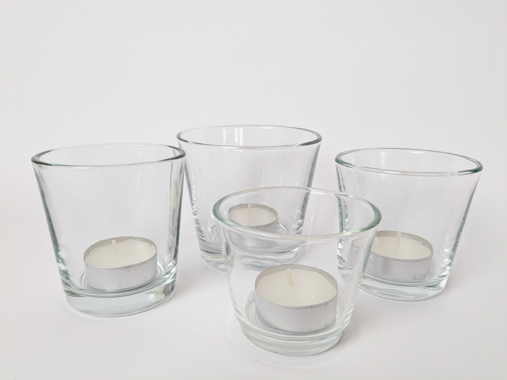 Egyforma alakú, különböző méretű, üveg mécsestartók.